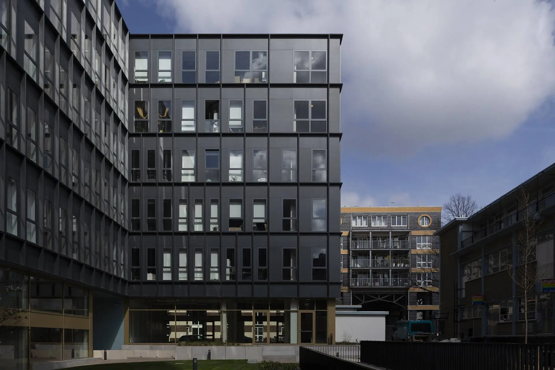 For energy efficiency, the façade was carefully designed using prefabricated modules and a gradual change in scale, adding great dynamism. The use of dark colors allows the building to stand out in its environment.