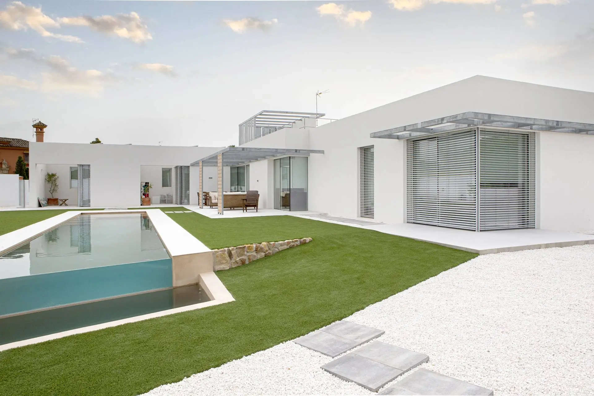 The Premium Plus roller shades integrate seamlessly into the design, installed in a recessed curtain box and completely hidden when closed. Made with Screen fabric, they offer excellent thermal protection.