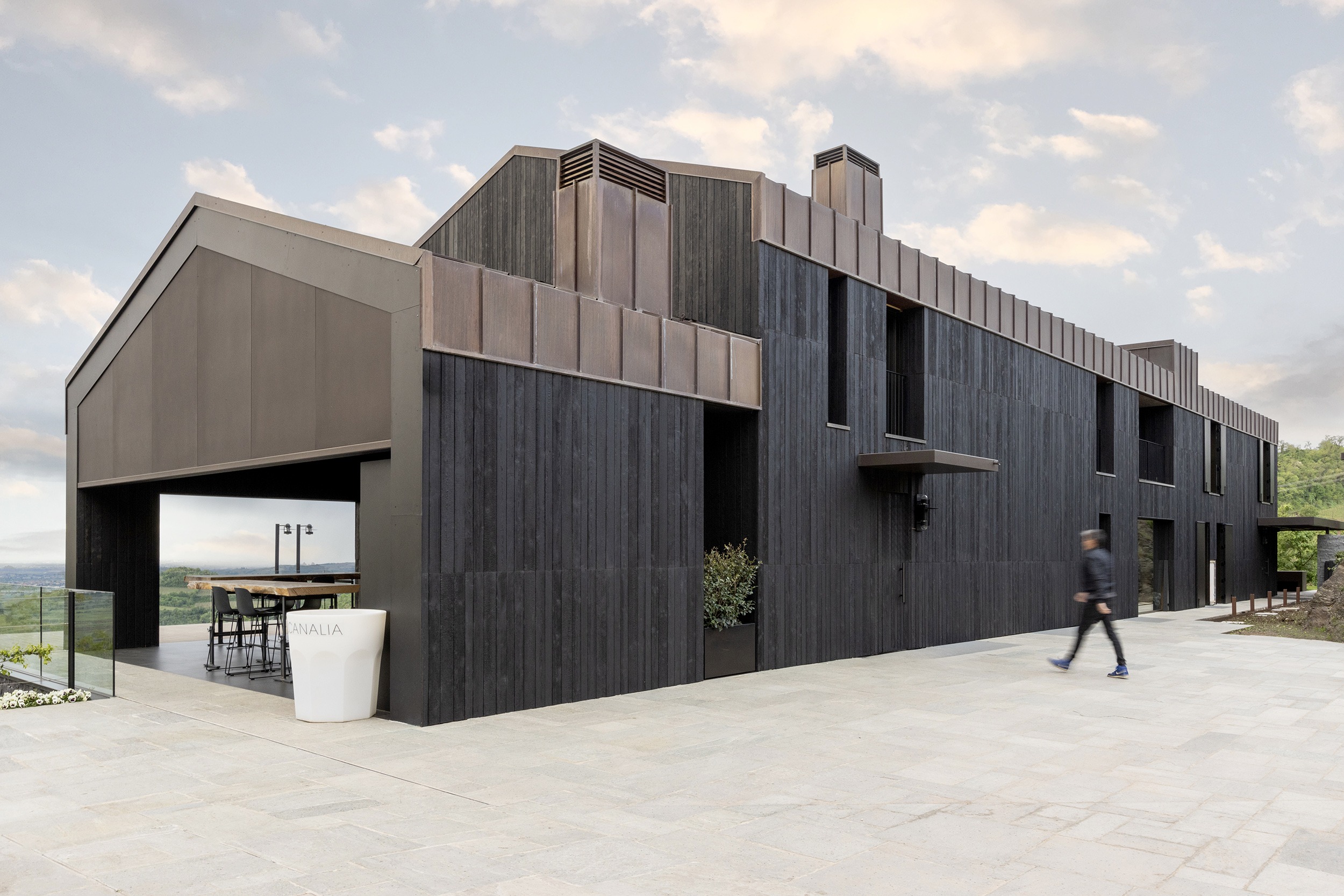 Azienda Volcanalia is clad in wood treated with a traditional Japanese technique called Yakisugi, a process that uses fire to create a charred finish.