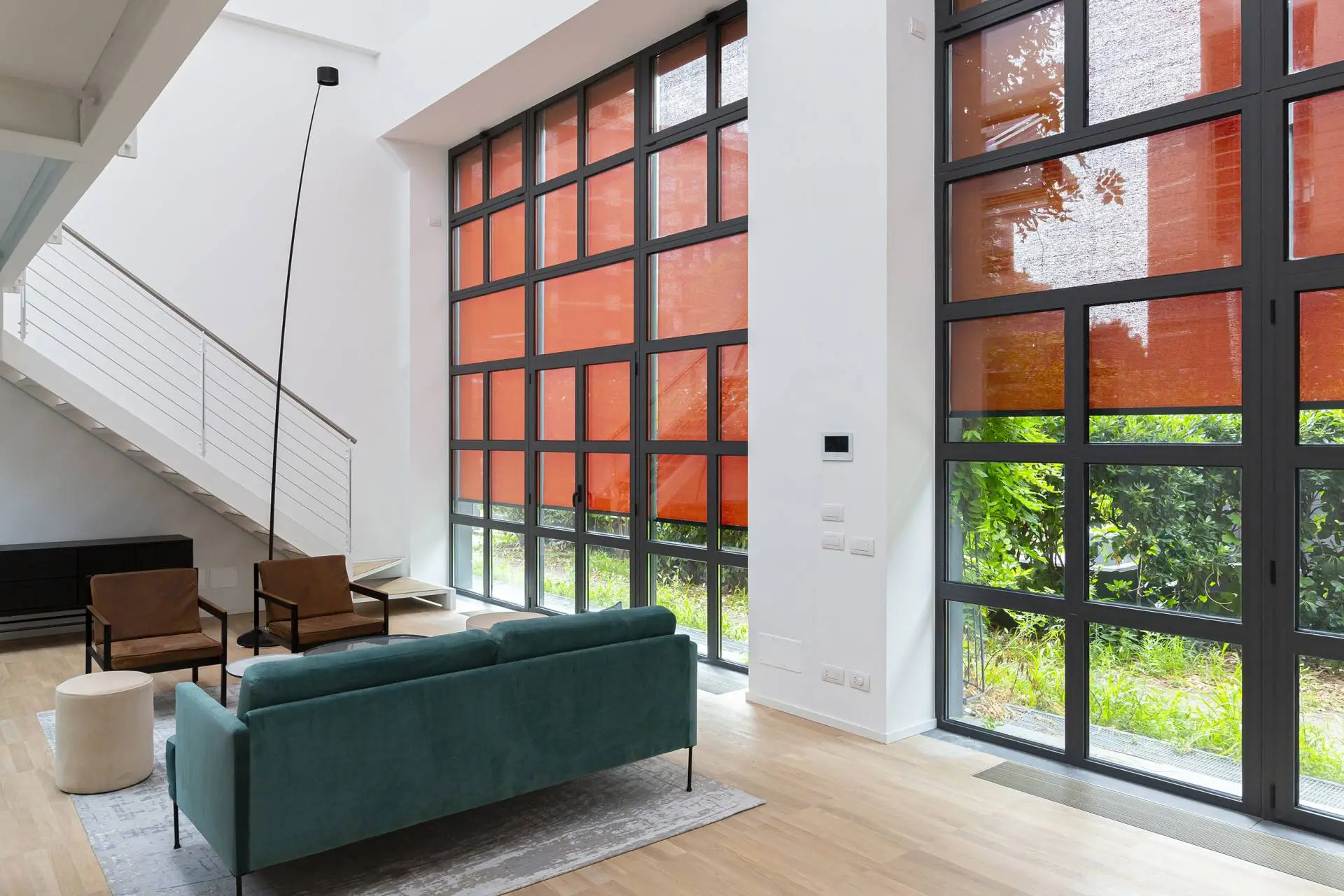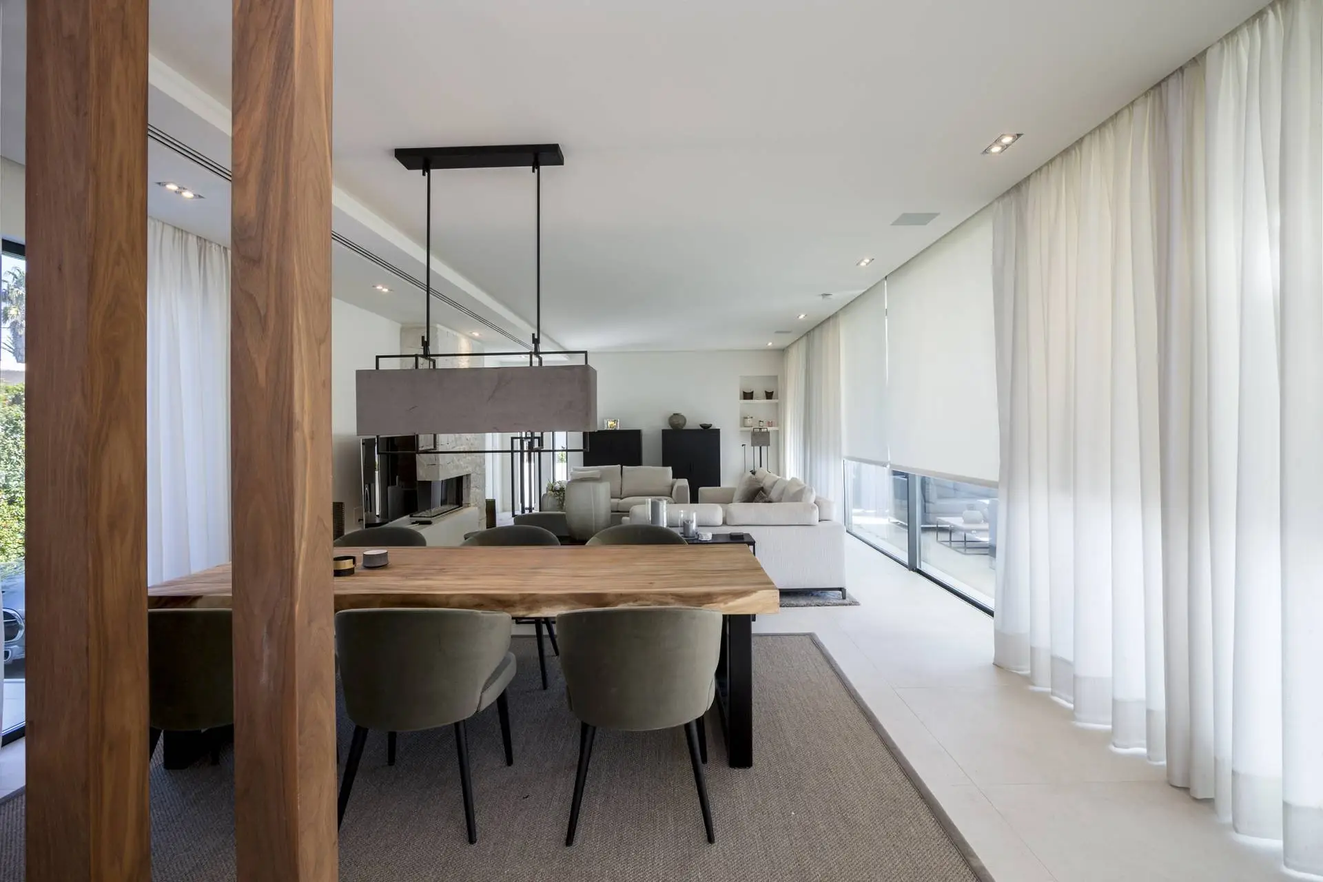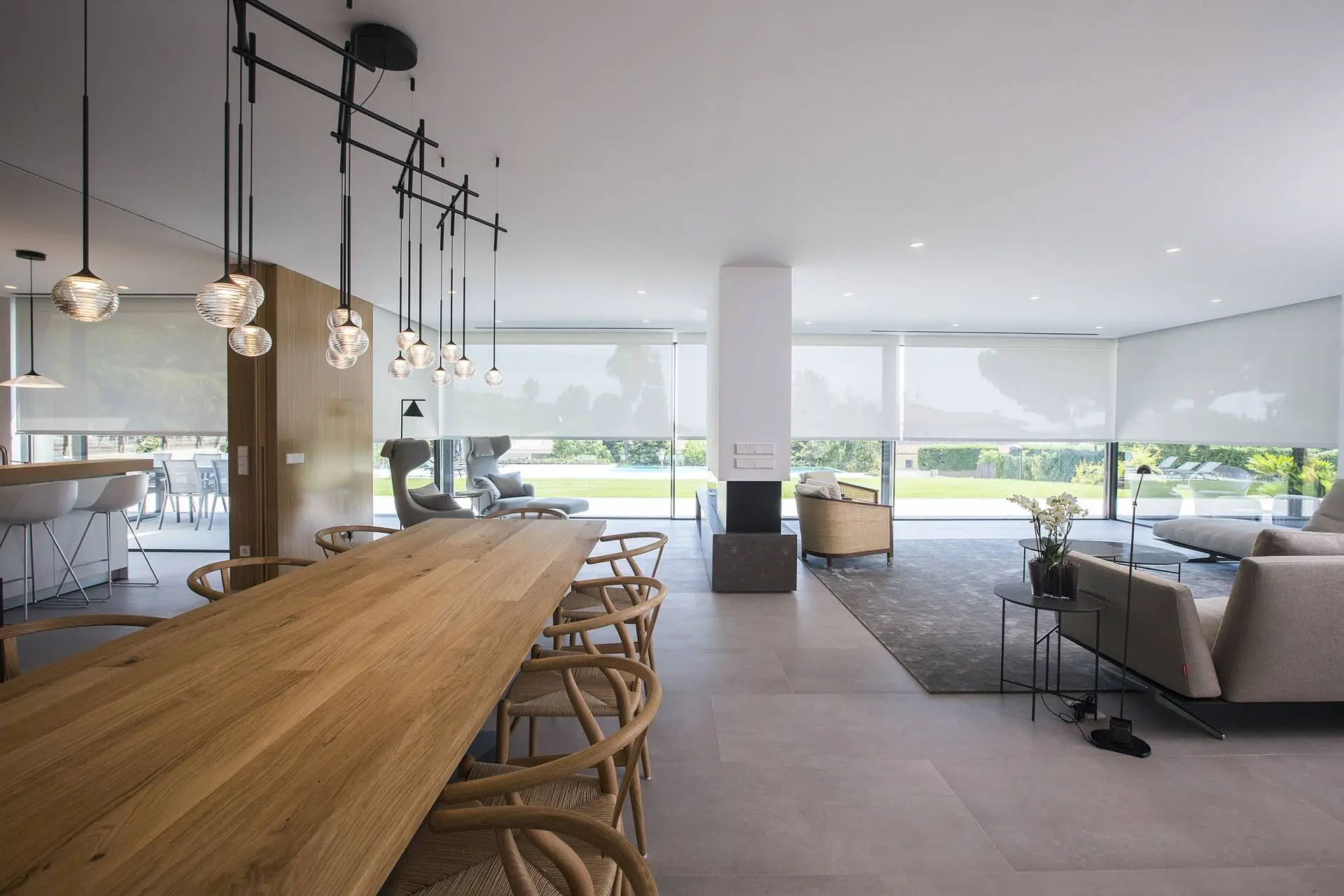 Arion roller blind and motorized traditional curtain, two systems united by contemporary architecture and home automation.