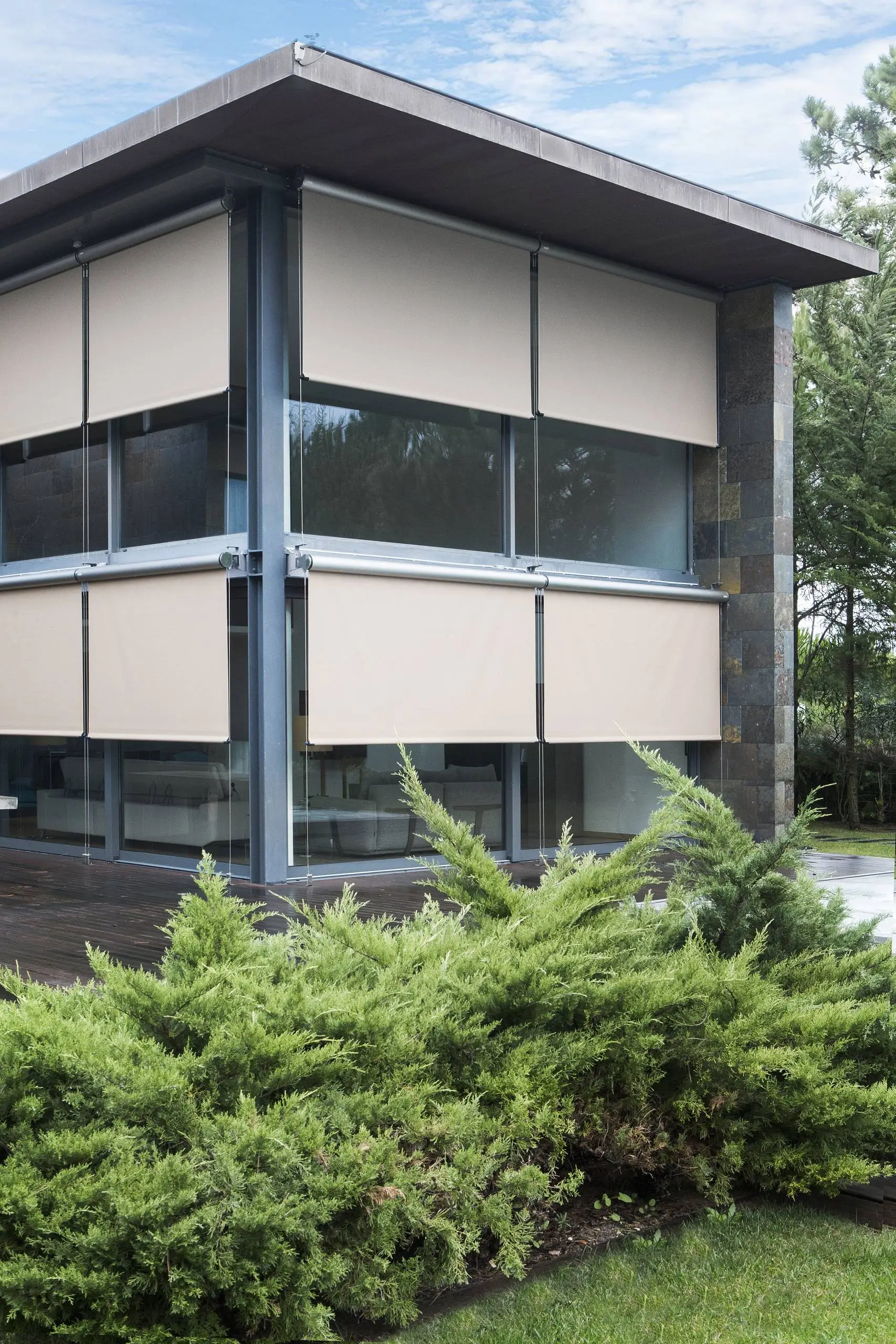 The O-Box is a roller shade with a cylindrical cassette and stainless steel components that withstand the most demanding outdoor conditions.