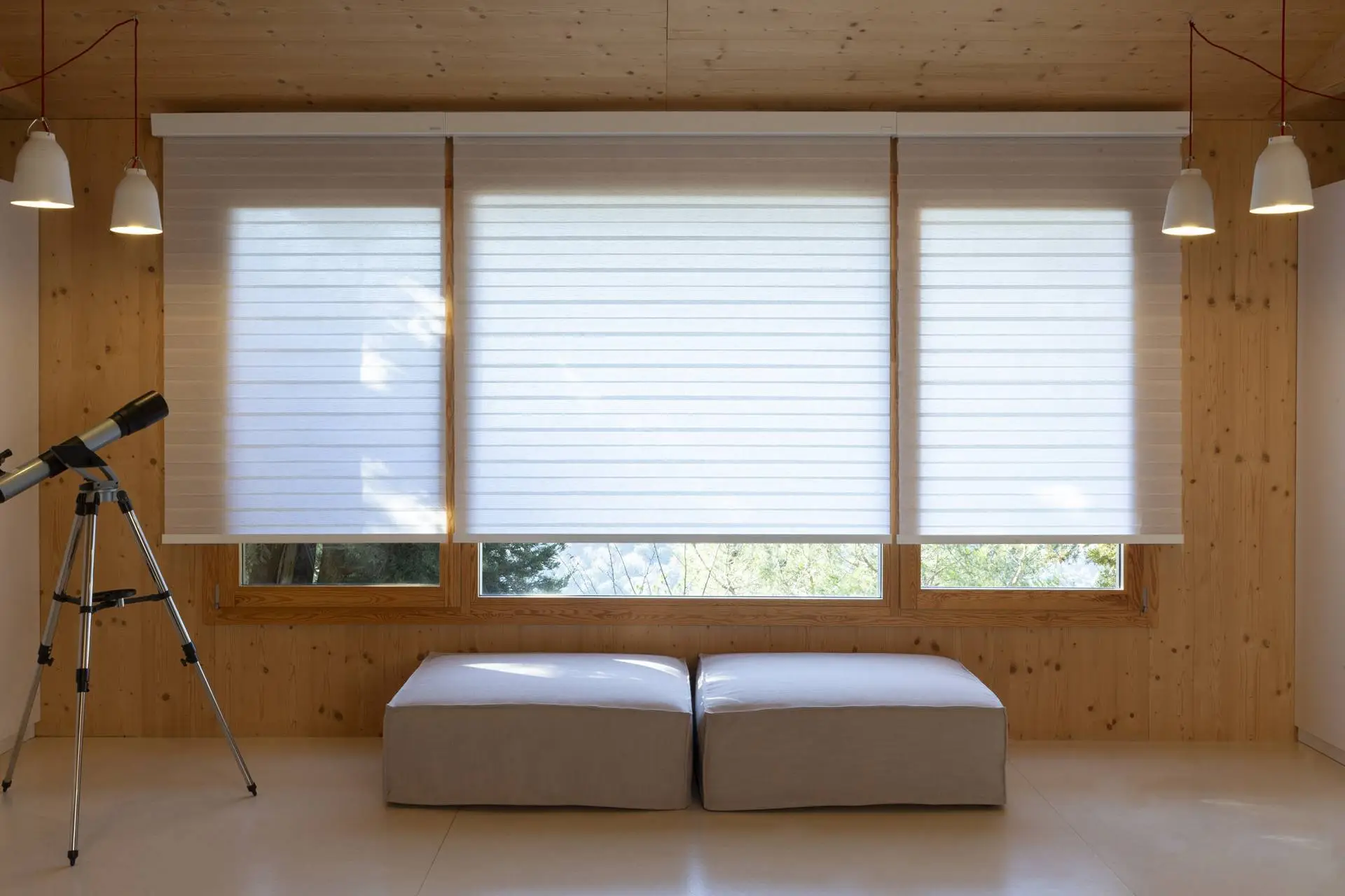 The alternating translucent and blackout fabric bands offer exact control of light entry and privacy at any time of day.