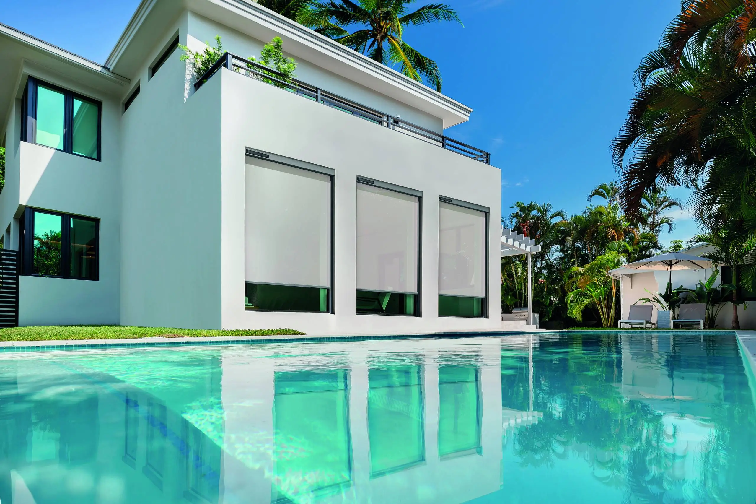 Z-Box Solar is an outdoor zip roller shade with zipper-guided side channels that ensure maximum fabric tension and wind resistance.