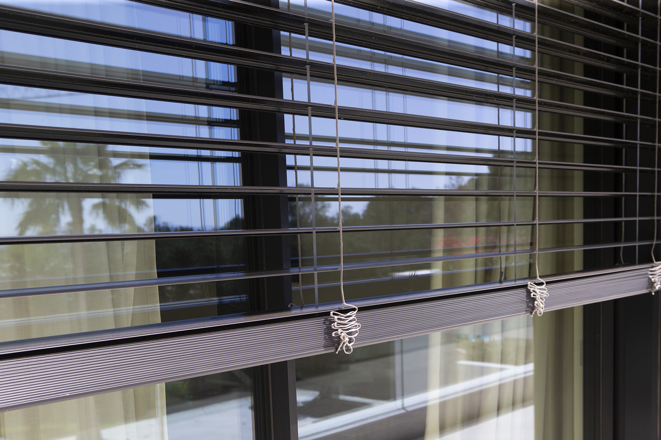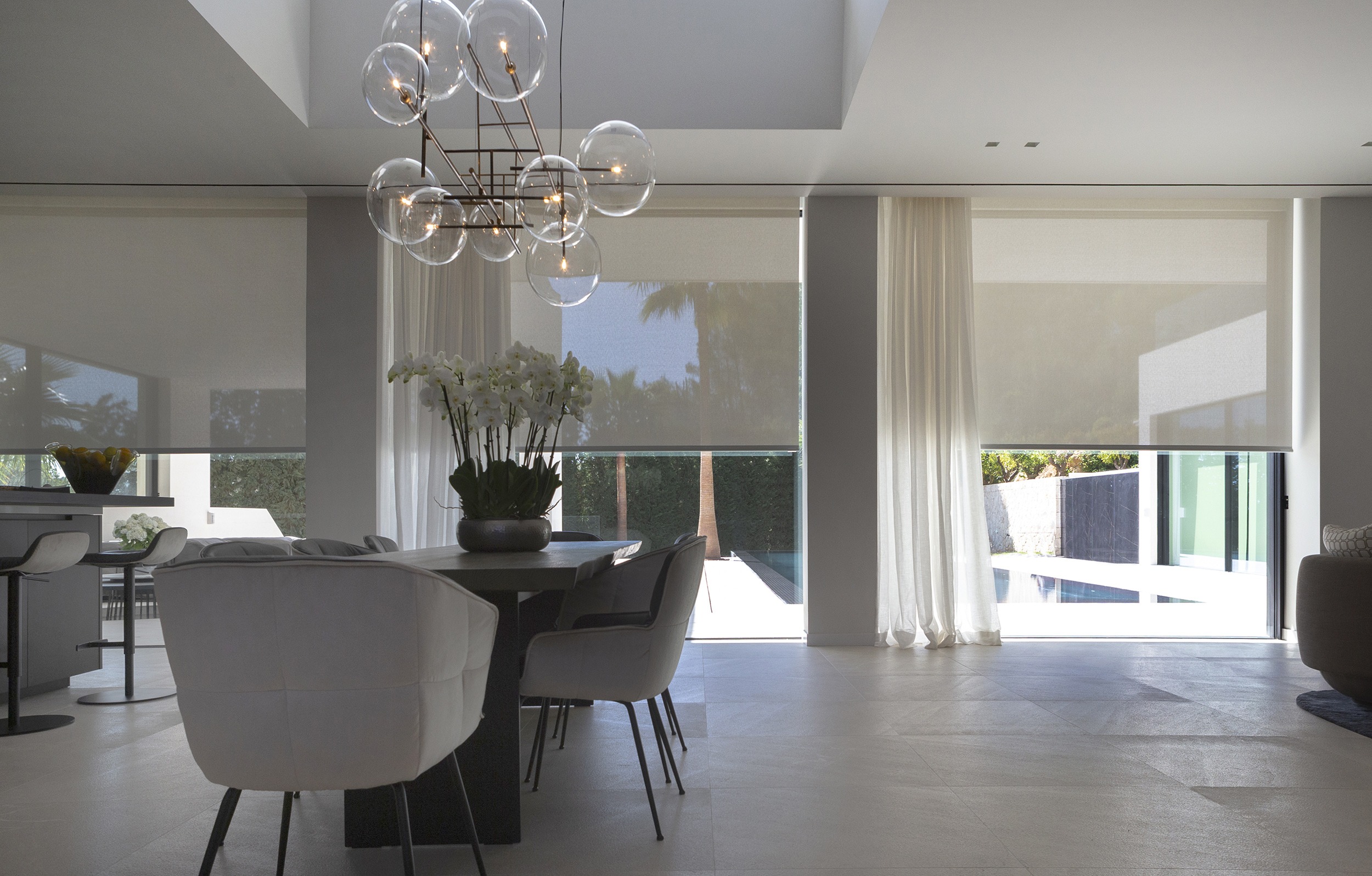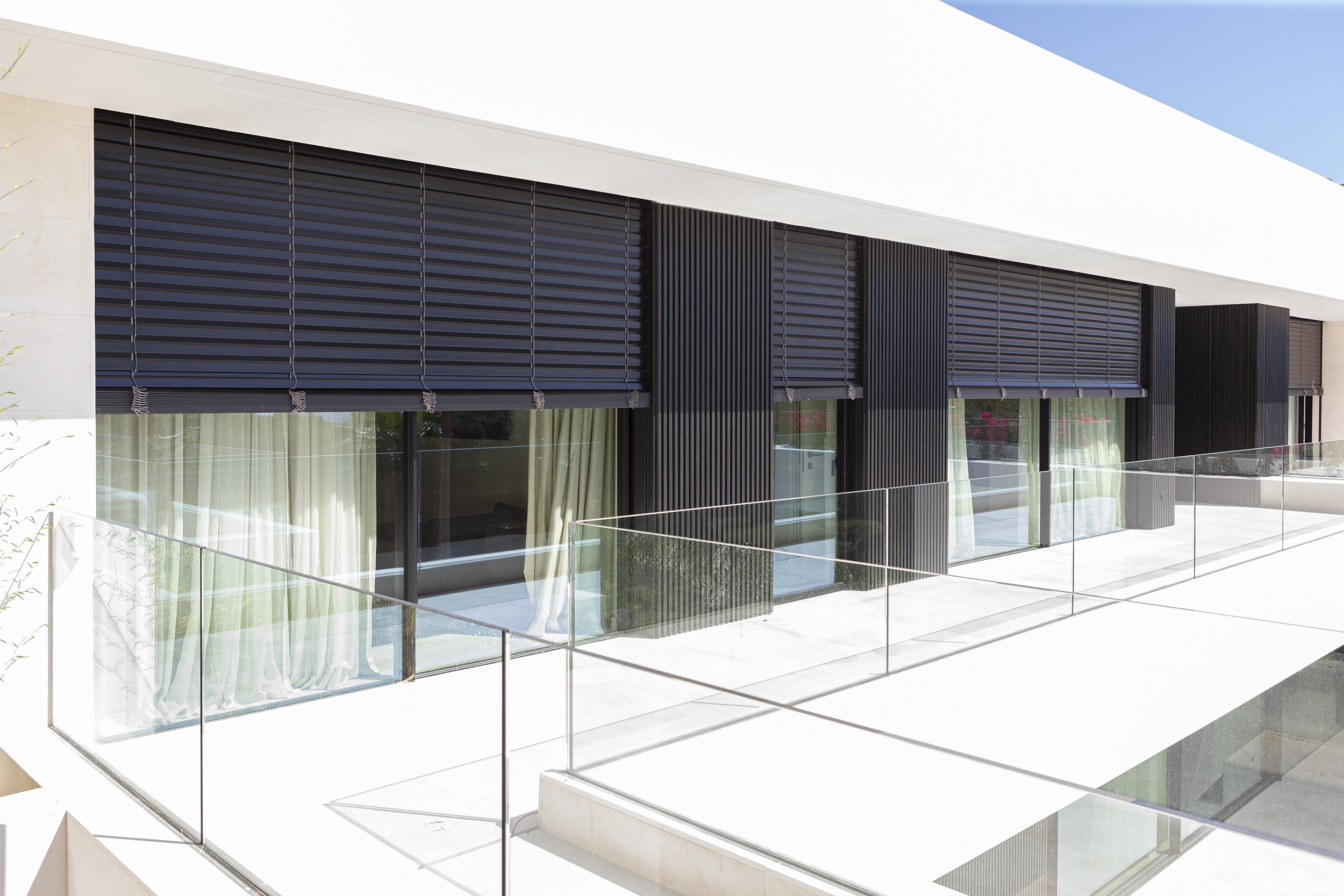 En este proyecto, las cortinas venecianas para exterior BSO de Bandalux permiten mantener la temperatura interior durante todo el año, gracias a la inclinación ajustable de sus lamas, que bloquean luz y calor y ofrecen hasta un 10% de ahorro energético. Su resistencia y durabilidad las hacen ideales para exteriores. En el interior, se instalaron persianas enrollables y cortinas tradicionales como complemento funcional y decorativo.