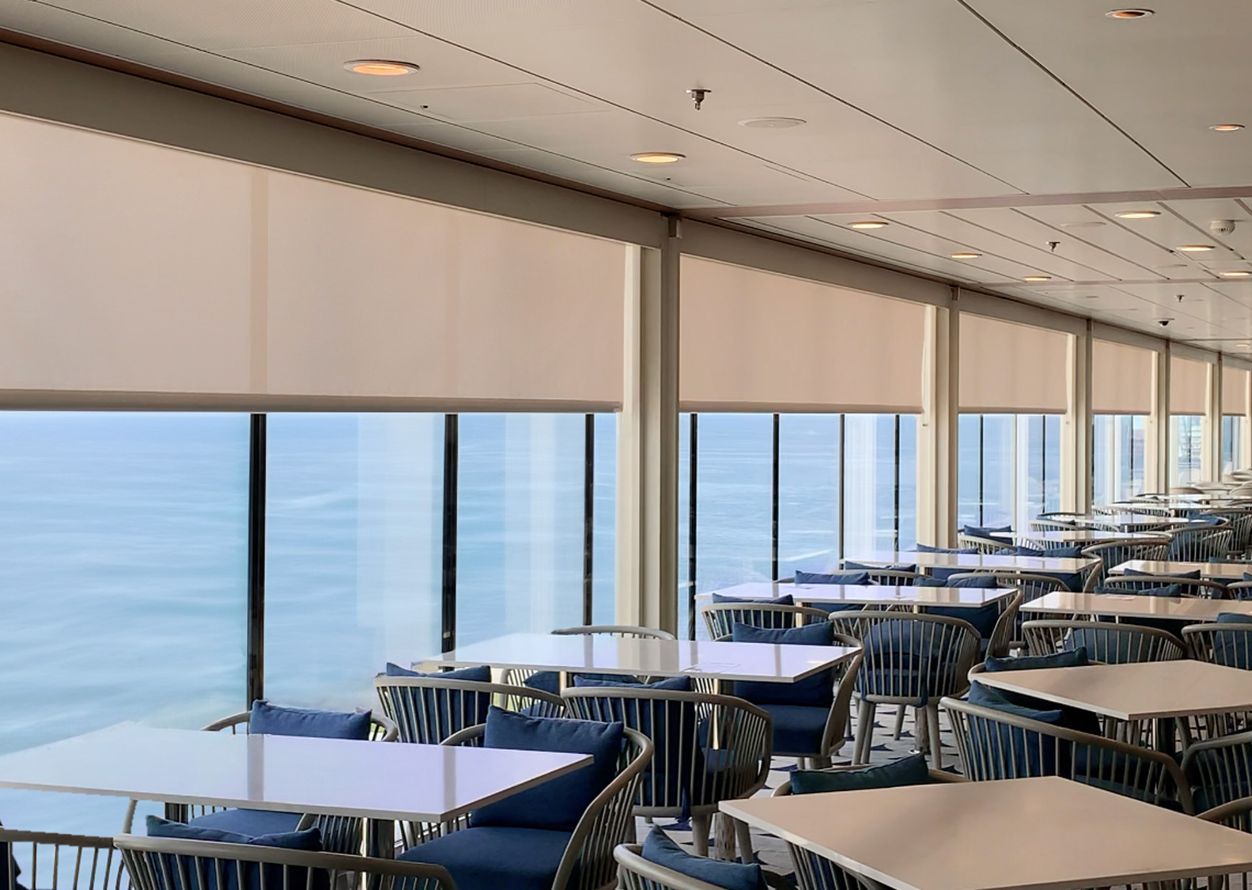 More than 120 manual cable-guided roman shades with textile fabric were installed in the Saphire dining room, giving the space the required harmony. A technical solution with class that maintains views to the outside while providing optimal solar control and visual comfort inside.