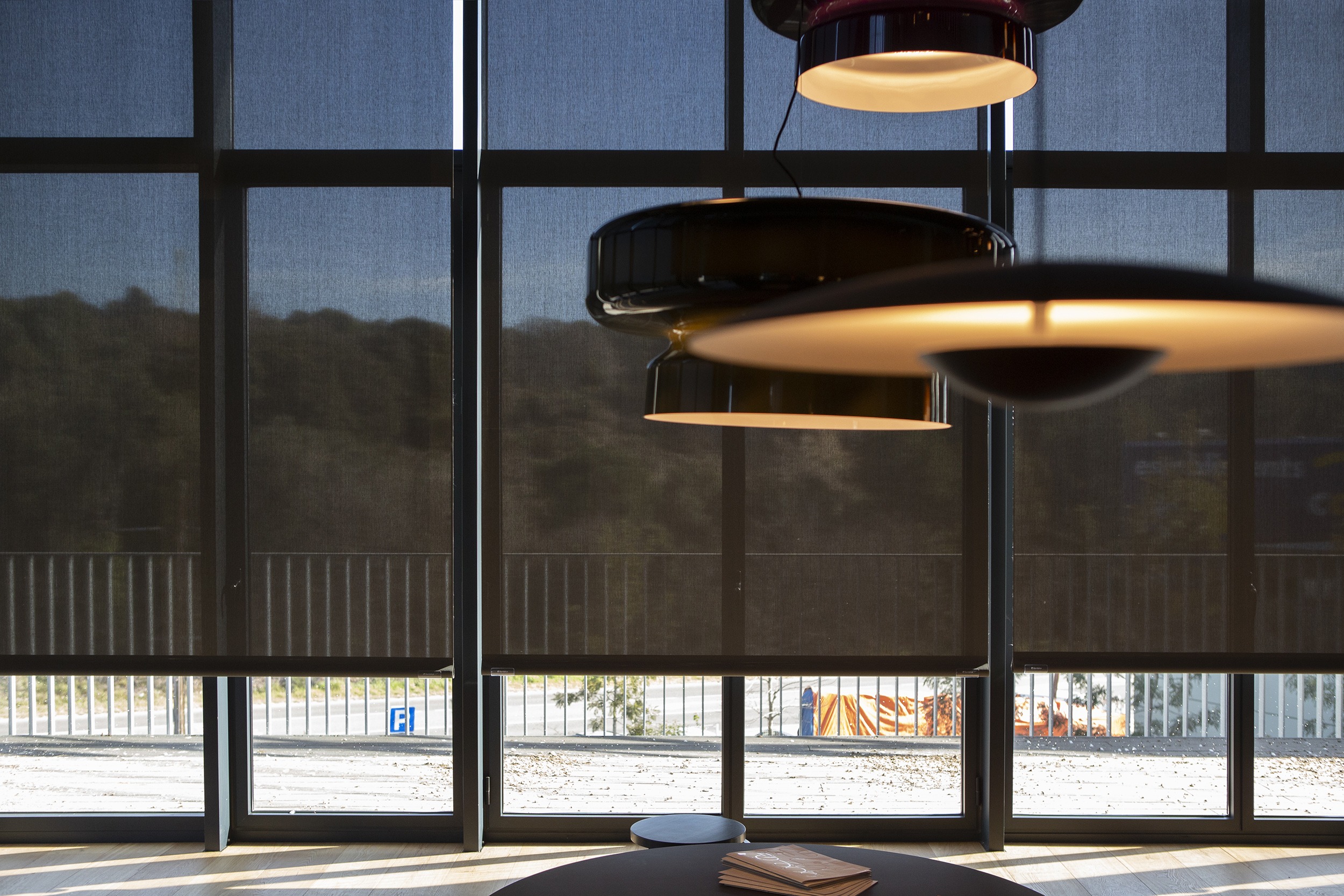 On the large glazed façades, Premium Plus roller shades with Screen fabric are used. They harmonize with the brand’s colors and style, while also providing optimal solar management. For the windows connecting office interiors with corridors, aluminum Venetian blinds in Smokey Grey finish are used, offering privacy to workspaces.