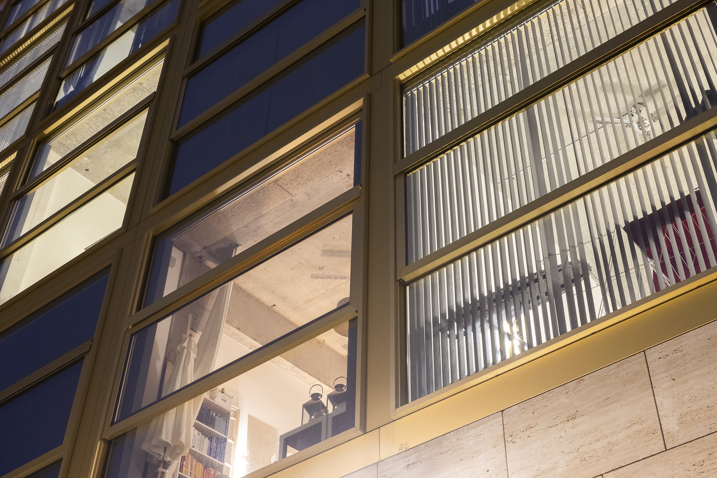 The façade plays with light by incorporating horizontal sliding windows that frame the building within its surroundings and evoke the horizontality of the existing structure.